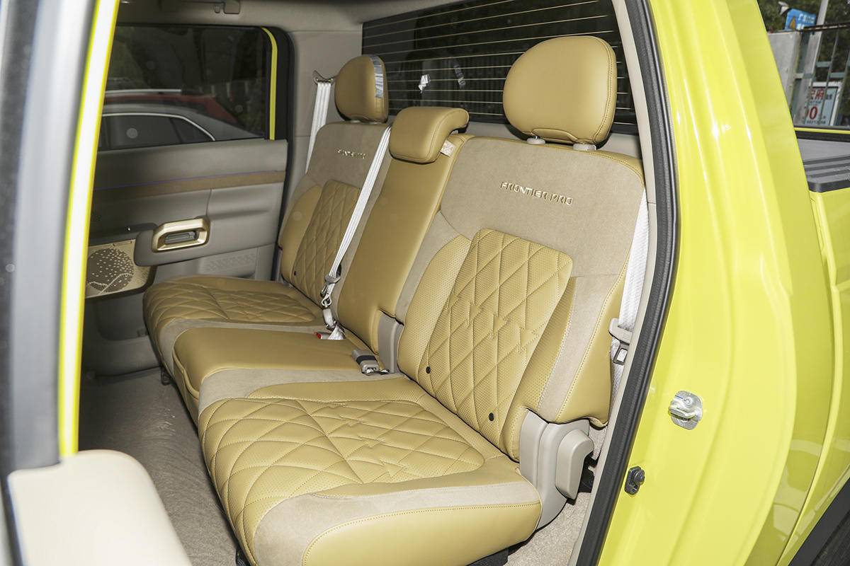 座椅使用了最新的菱形缝线纹理,座椅靠背带有Frontier Pro字样,增加了档次感。后排有着不错的空间表现,带有三个头枕,靠背能够4/6比例折叠。
